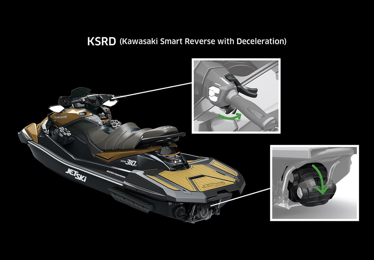 O sistema Kawasaki Smart Reverse com Desaceleração opera eletricamente a concha de reverso, controlada por um prático interruptor de polegar na manopla direita. Ele permite ajustar a propulsão com uma única mão, tornando manobras e desacelerações mais precisas, seguras e suaves em qualquer situação de pilotagem.